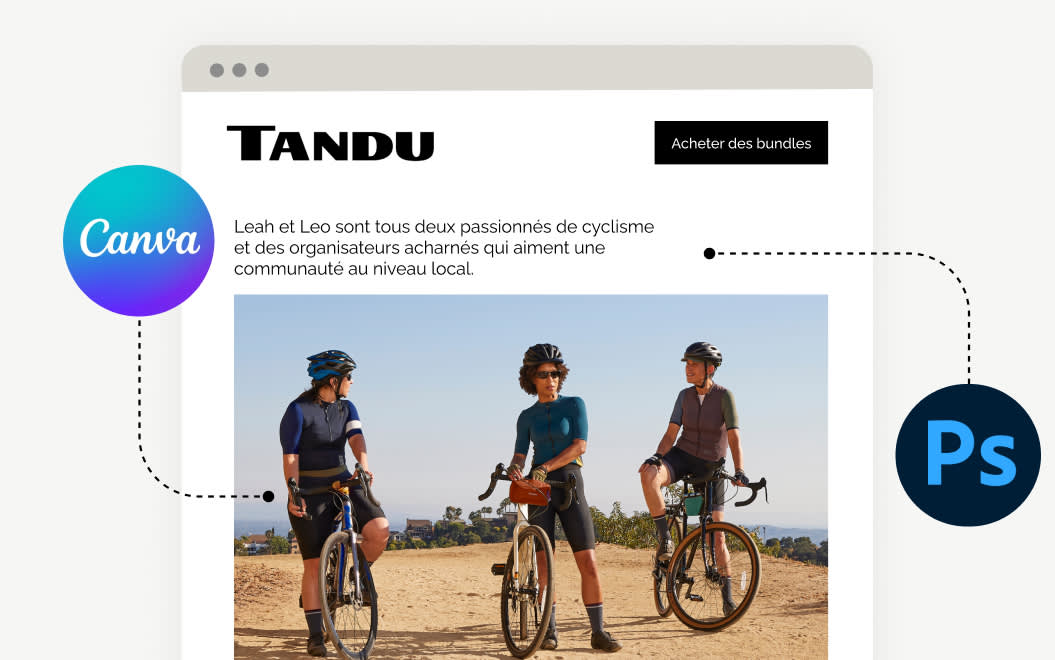 Notre bibliothèque de plus de 300 intégrations comprend des outils de création populaires, ce qui vous permet de créer et d'importer instantanément vos modèles existants dans Mailchimp.