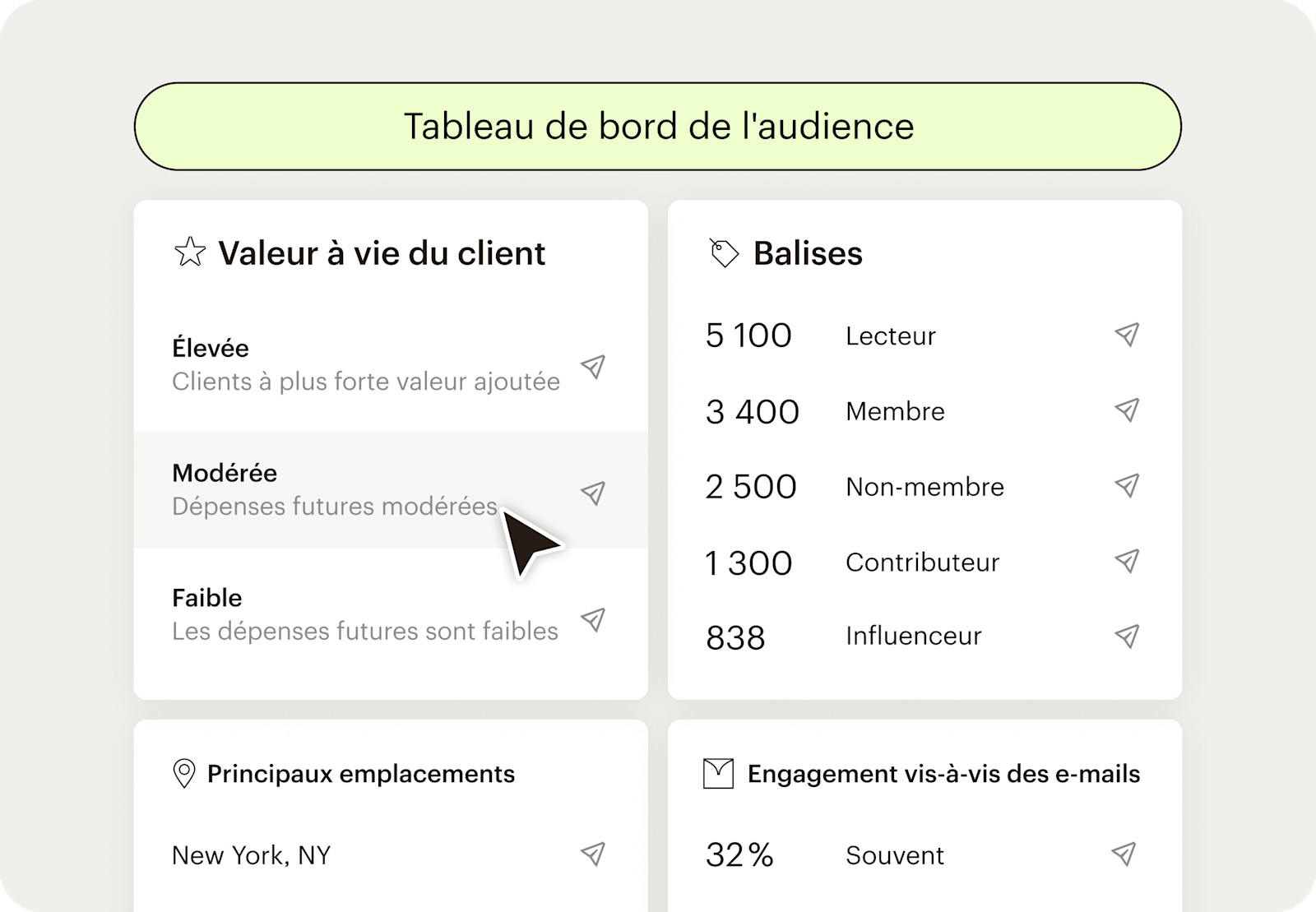 Les outils d'audience de Mailchimp vous aident à stocker, segmenter et comprendre vos clients pour leur offrir les expériences personnalisées les plus pertinentes.