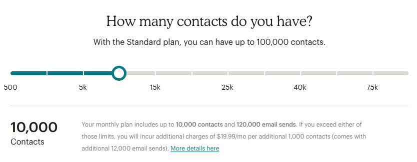 The price of the add-on contact block, and the number of contacts and email sends it includes, depends on your plan and pricing tier. If you’re logged into Mailchimp and you set the maximum contact count for your plan, we’ll tell you how many contacts and email sends are included, as well as the price and size of add-on contact blocks (with additional email sends).
